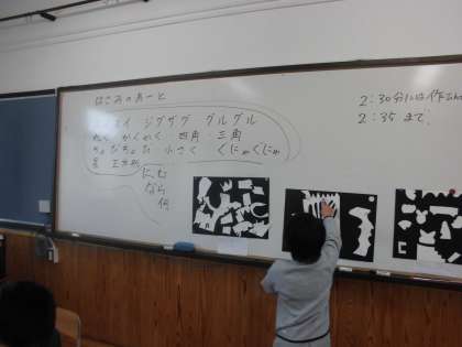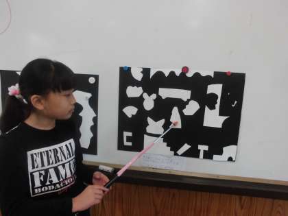 はさみで紙を切って,画用紙に貼付け作品作りをしていました。
