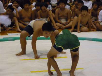 池田小学校で,支部のすもう交流会が行われました。参加する子どもたちは意欲満々で会場に行きました。当初は,池田小学校の常設のすもう場で行われる予定でしたが,雨のために急遽,体育館で実施されることになりました。どの試合も,参加した子どもたちは一生懸命にがんばり,白熱した試合ばかりでした。結果は,1年男子の部で磯井くんが1位,3年女子の部で磯井さんと堀さんが3位という好成績でした。