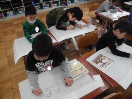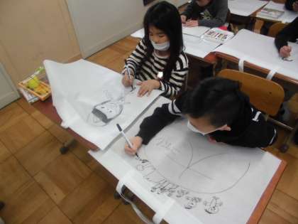図画工作の時間に作った作品を入れる,作品バックを作っていました。
