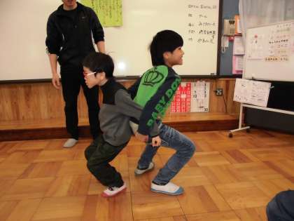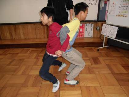 3くみの「シャキトレ」の様子です。二人で背中を合わせて座る姿勢を取ります。「足にくる。」と子どもたちも言っていて,よく効いていたようです。