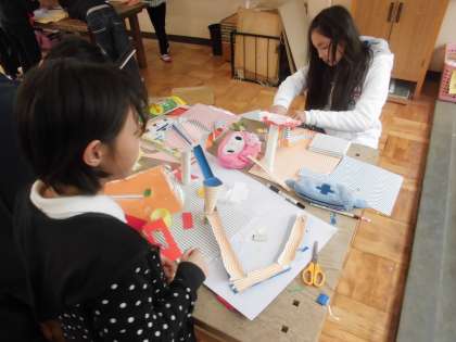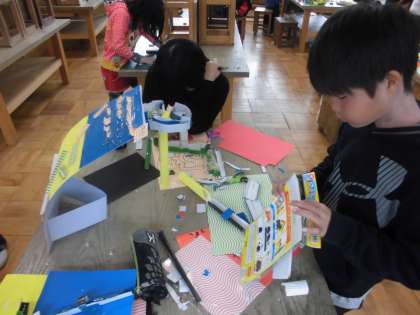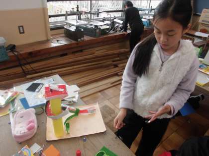 図画工作の時間に,「コロコロガーレ」を学習しています。今日は,ビー玉の転がる仕組みを考えていました。