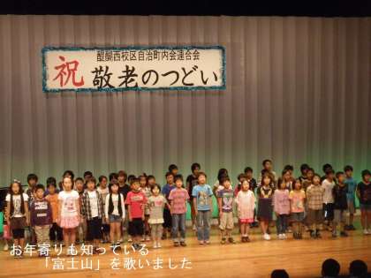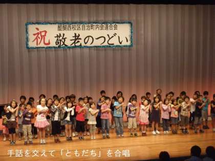 多くのお年寄りの前で,お年寄りもよく知っている「富士山」そして,手話を交えて「友達」の2曲を歌ってお年寄りをお祝いしました。大きな声でしっかり歌えてよかったです。