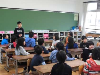 自己紹介をしています。好きなことや今年がんばりたいことを発表しました。聞く姿勢もしっかり。高学年の仲間入りです。