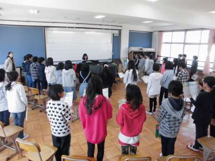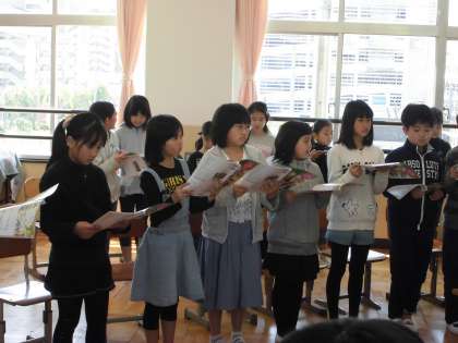 1組と2組が合同で音楽の学習をしました。「ビリーブ」をきれいな歌声で歌っていました。教科書の持ち方から練習です。