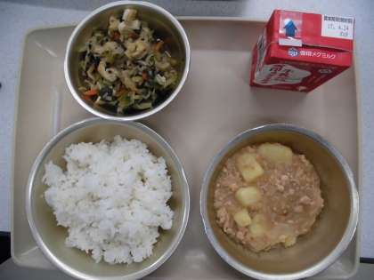 今日の献立は「麦ごはん」「牛乳」「じゃがいものそぼろ煮」「切干大根の煮つけ」でした。今日もおいしくいただきます。