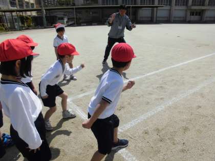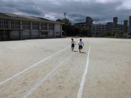 体育の時間に50メートル走の練習をしました。「いちについてよーいっどん」みんな一生懸命走りました。