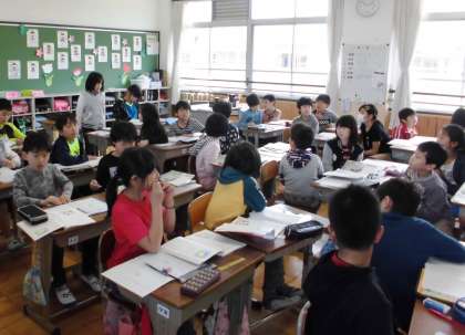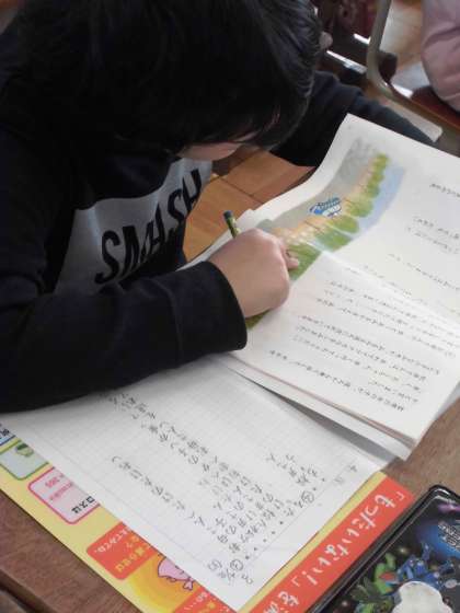 国語で「白いぼうし」の学習をしています。発表する人の方を向いて話を聞く姿勢もしっかりしています。ノートも丁寧に書いています。