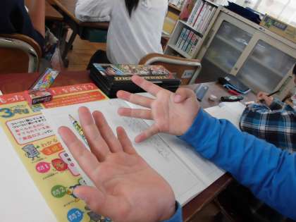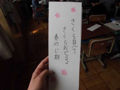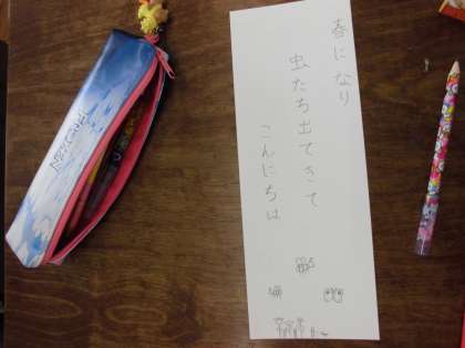 俳句の学習をしたあと,「5・7・5」で春の俳句を作りました。指をつかって必死に考えています。