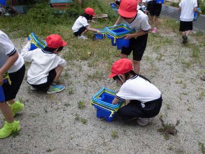 あさがおの種植えのための準備をしています。今日は水はけをよくするために鉢のそこにひく小石を集めました。