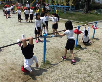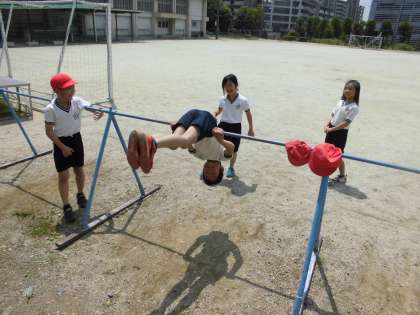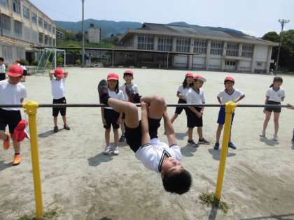 今日も体育で,てつぼうの練習をしていました。いろいろな技に挑戦しています。「もうさかあがりできる!」「ちきゅうまわりは難しい!」元気にがんばっています。