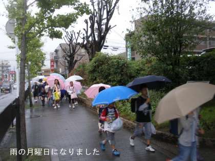 雨降りの週明け(月曜日)になりました。朝休み,中間休みに運動場で遊べなくて残念です。午後からは止んでくれるかな??