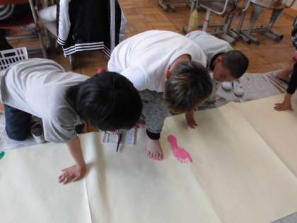 教室に掲示する学級目標づくりの様子です。足型もペタ。自分たちの学級目標のために一人ひとり一生懸命に活動する姿とてもよかったです。