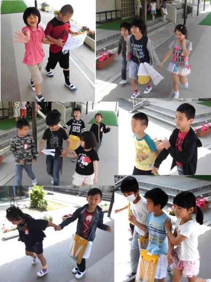 3時間目から1・2年生は学校探検です。2年生は今日のためにたくさん準備をしてくれました。最初に自己紹介やゲームをして,仲よく探検できるように楽しみました。出発する頃には,みんなニコニコでした。1年生は2年生のお兄さん,お姉さんに手をつないでもらい,いろいろな教室の説明をしてもらいました。