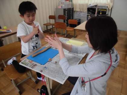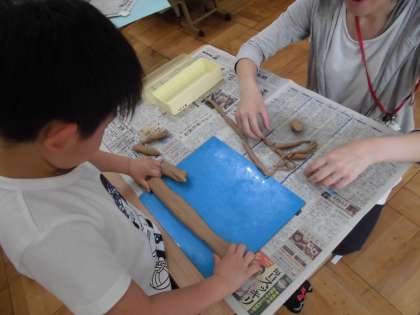 小学校に入って初めて粘土の学習をしました。粘土をちぎったり,手で転がしたりのばしたりしました。作っているうちに「ミミズに見える!」と気づきがありました。