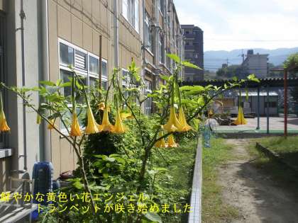 昨日の雨で学校内の樹木も様変わりしたようです。昨日までまったく咲く様子がなかった中庭の「エンジェルトランペット(朝鮮アサガオ)」が今朝,見事に咲き始めました。鮮やかな黄色い花は,まさにトランペットのようです。