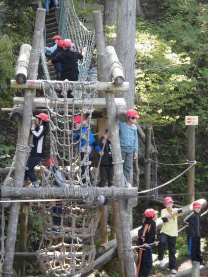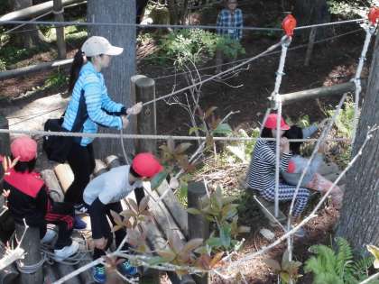 3日目の朝は,シュラフを干してから,『冒険の森』でアスレチックに挑戦です。グループで個人で,思い切り楽しんで発散しまし。