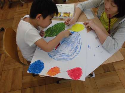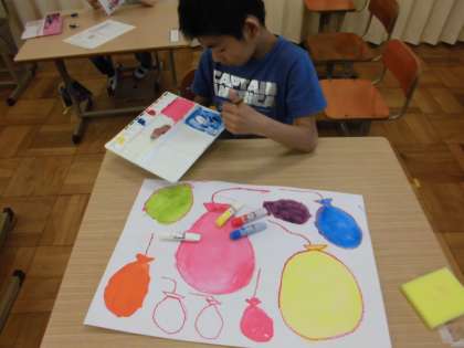 ふうせんの絵を1年生はクレパス,3年生は絵具で色を塗りました。赤色と黄色を混ぜるとオレンジ色に,青色と赤色を混ぜると紫色に,重ねると色が変化することを楽しんでいました。