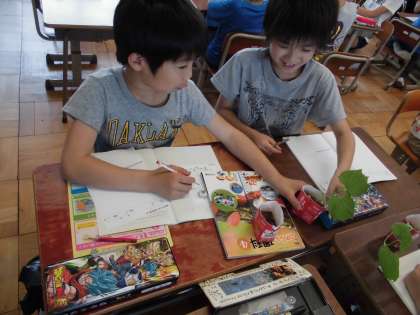 どんどん成長するツルレイシ。巻きひげを細かいところまで観察して観察ノートをかきました。