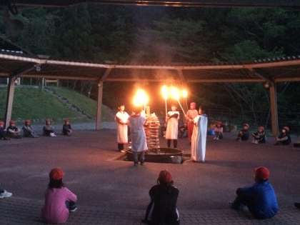 少しずつ日が落ちて暗くなってきました。静かで落ち着いた雰囲気の中,火がつきます。