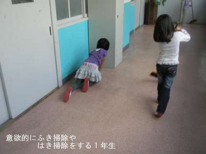 ずっと6年生に手伝ってもらいながらそうじをしていた1年生も,すっかりそうじの仕方を覚えてはきそうじ,ふきそうじをがんばっています。