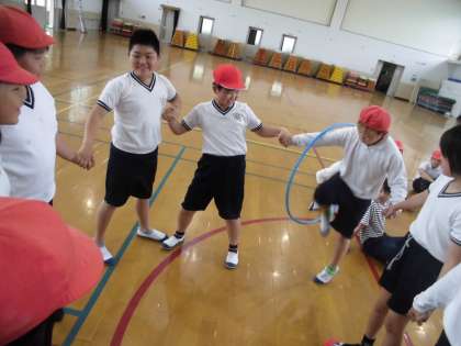 新聞やフラフープを使ってクラスの友だちと協力して運動をしました。友だちとかかわりながら,体を動かす楽しさや心地よさを味わっていました。