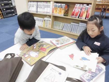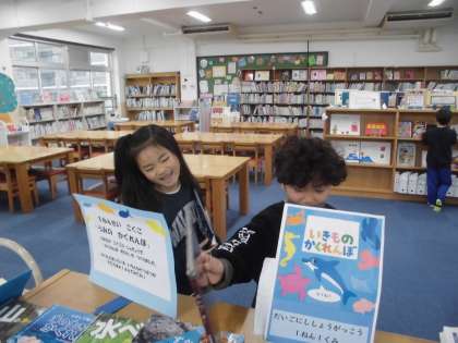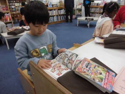 本を返した後、今週の本を借りて、友だちと仲よく読む人、一人でじっくり読む人。