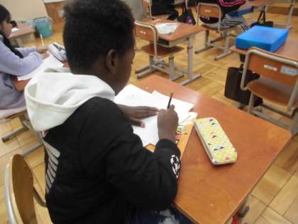 教室の中の漢字を探して回る子どもたちです。