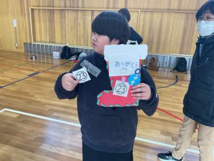 中学校の子どもたちが進行役となり、はじめの言葉やルール説明、終わりの言葉までリードしてくれました。みんなで「鬼ごっこ」「ふえおに」「だるまさんがころんだ」を楽しんだ後、クリスマスプレゼント交換をしました。笑顔いっぱいの楽しい時間になりました。