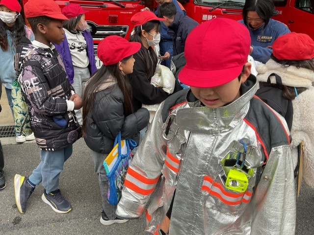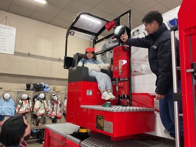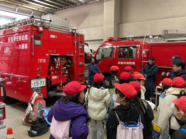 社会科の学習で、消防署見学に行きました。消防士の方に署内を案内してもらったり、実際に消防車に乗せてもらったりしました。