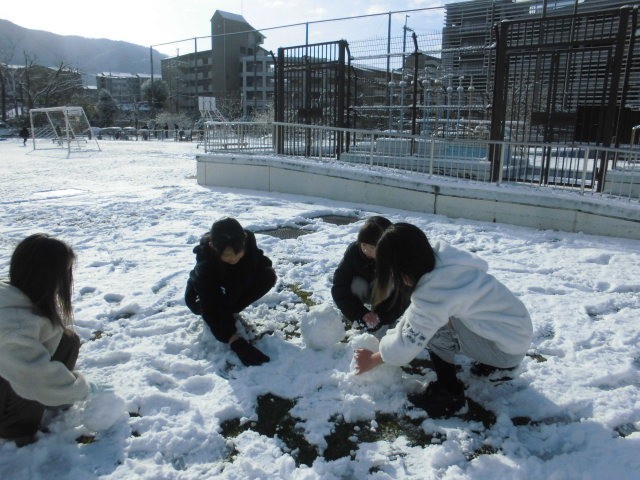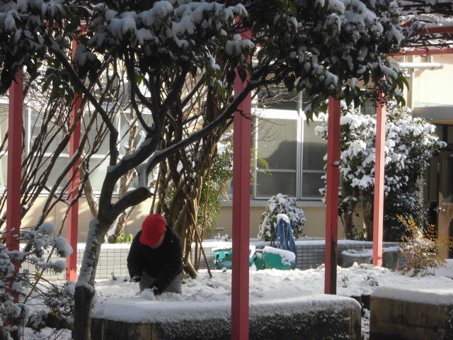 朝の、まだ雪が残っている間にみんなで外に飛び出して、雪だるまを作ったり雪を集めたりしました。