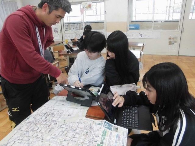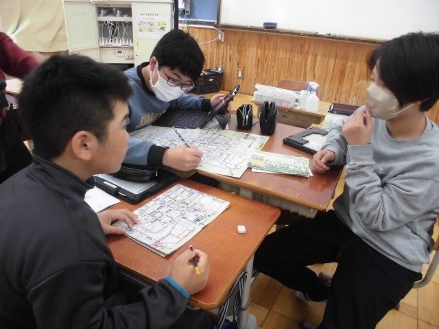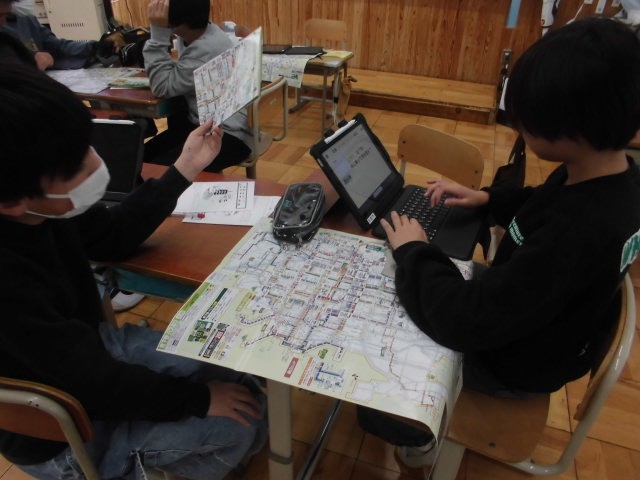 市営地下鉄や市バスの路線図を見ながら、タブレットも使って一生懸命に調べました。