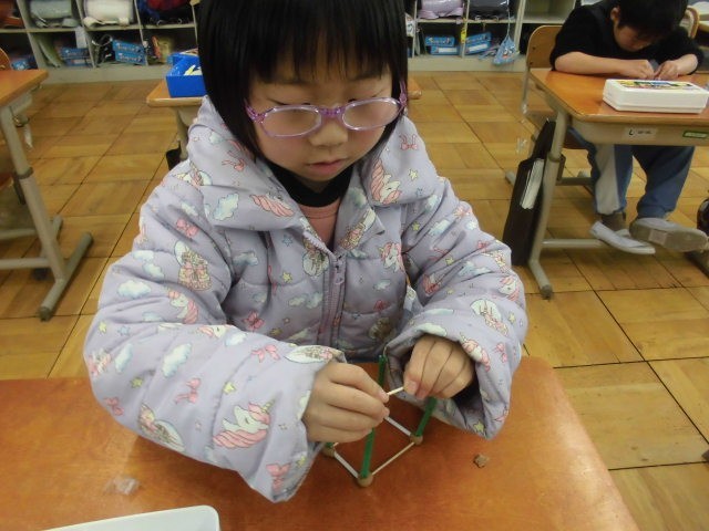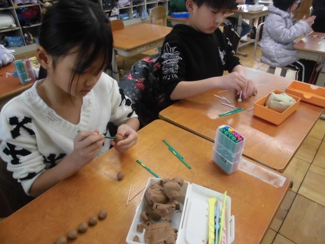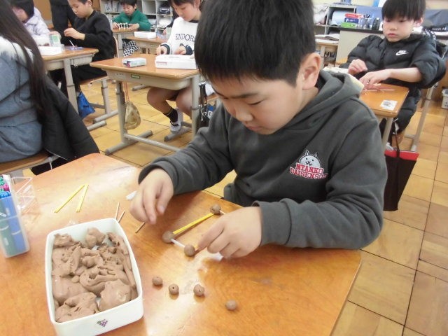 粘土やひごなどを使って、はこのかたちを作りました。
