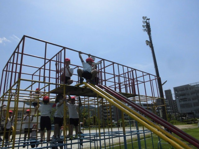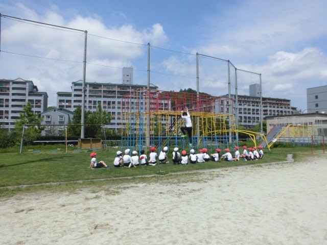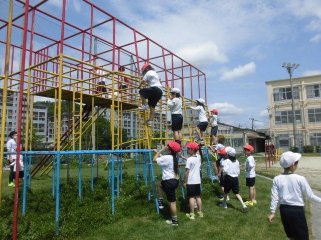 体ほぐしとして「だるまさんが転んだ」をしました。その後、総合遊具の安全な使い方を学習し、3階まで使って遊んでみました。
