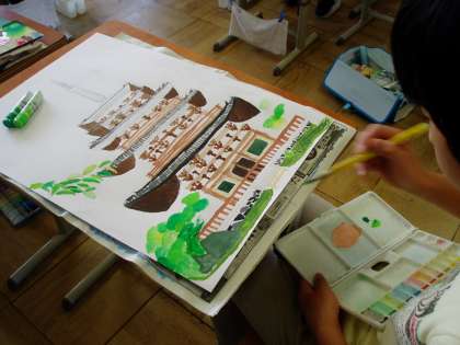 先日,6年生の子どもたちは醍醐寺で写生を行いました。今日は,その絵の完成に向け絵の具で色をぬりはじめています。