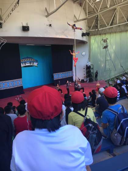 野外ホールでのサーカスを鑑賞しています。妙技の数々に思わず,体を乗り出してしまいます。