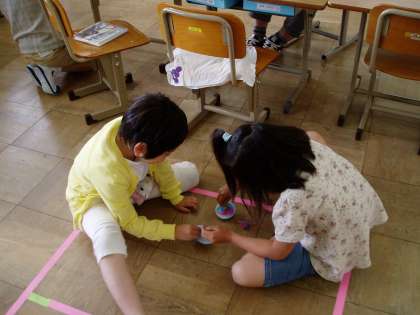 あすなろ学級の子どもたちは,コンパスを使って『コマ作り』をしていました。コンパスで円を描き,色鉛筆などで模様を塗った後にハサミで切り抜きました。