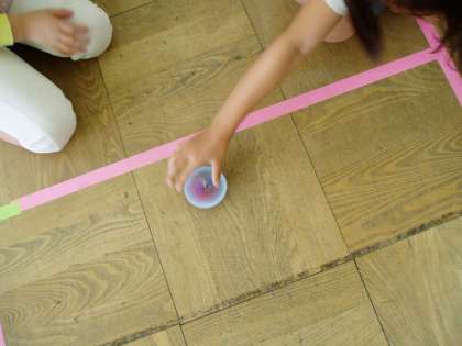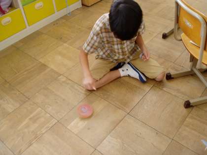 コンパスを使った際に出来た穴に爪楊枝を差し込んでコマの出来上がりです。爪楊枝を刺した場所を『円の中心』ということも学習していました。