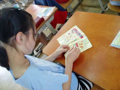 5年生の子どもたちは,家庭科の学習で裁縫に挑戦しています。今日は運針の練習用布を使って,波縫いにチャレンジしています。当然のことですが,子どもたちにとっては難しい活動です。