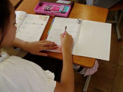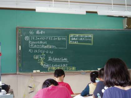 5年生は,どちらのクラスも『小数のわり算』を学習していました。今日は,小数のわり算で,ひっ算をして計算した時の『あまり』について考えました。
