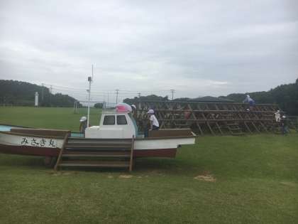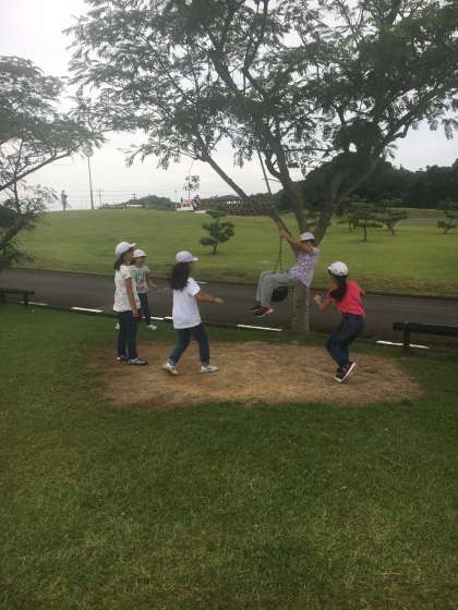 入浴までの時間,芝生広場でみんな自由に楽しい時間を過ごしています。雨はまだ降ってはいませんが,風が少し吹いてきました。