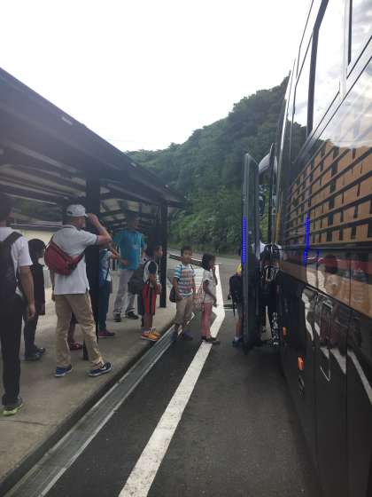 退所式では,みさきの家での活動を見守ってくれた学校の旗を降ろしました。この2日間お世話になったみさきの家の先生方ともお別れをし,バスに乗り込みます。本当にいろいろあったけれど,楽しかったみさきの家の活動でした。