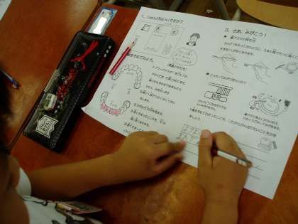 子どもたちは,赤く染め出された汚れの部分を手鏡で見つけ,プリントに記録をしていました。