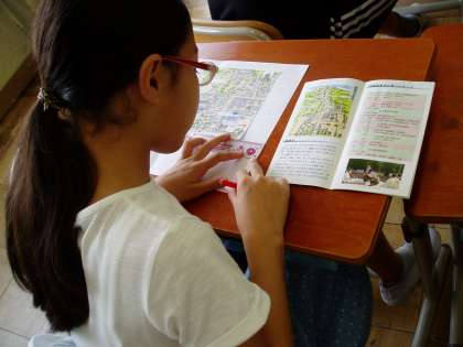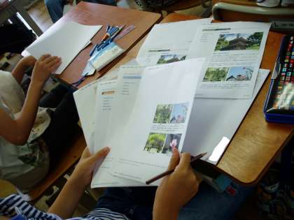 6年生は,総合的な学習の時間を活用しながら地域の歴史的な建造物や習慣について調べてきました。今日は,それらのことを国語科で得た『書く力や伝える力』を利用してパンフレットづくりをしています。
