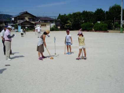秋風を感じつつも残暑が厳しい中,地域指導者の方々には大変お世話になっています。回数を重ね参加している子どもたちは,グランドゴルフの腕前を上げていました。