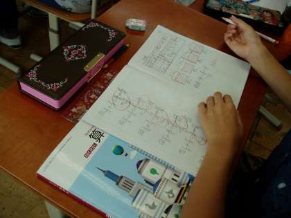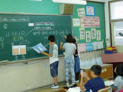 5年生の教室では,算数科の学習で異分母分数の引き算の方法を学習していました。ただ,計算ができるようになるのではなく,どうなれば計算できるのか図を用いながら説明できるようになることで理解を深めています。