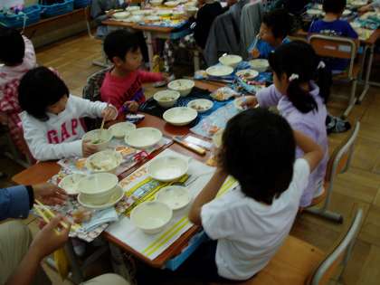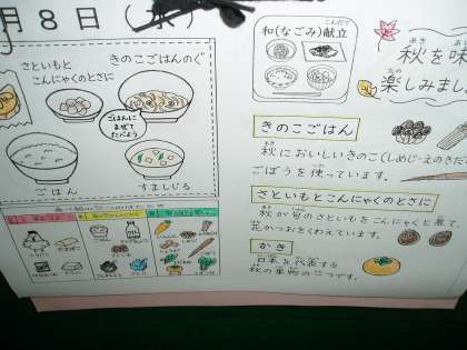 今日の給食は『なごみ献立』でした。メニューは『きのこごはんの具』『すまし汁』『さといもとこんにゃくのとさに』でした。『柿』もデザートとして添えられました。