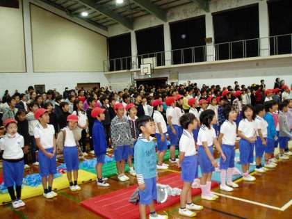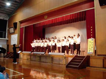 学習発表会の半ばでは,PTAコーラスの美しい歌声を聞かせていただいたり,全校合唱で『やさしさ いっぱい 北醍醐』を歌ったりしました。