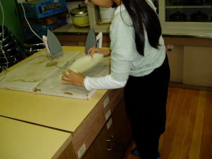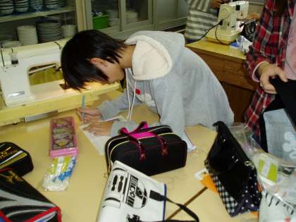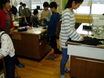 6年生は,家庭科室でミシンやアイロンを使って『エプロンづくり』をしています。それぞれが工夫を凝らしながら取り組んでいました。