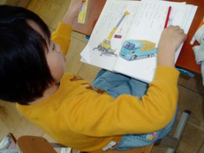1年生は国語科の学習で『じどうしゃ くらべ』という説明文の学習をしています。今日は,自動車の『しごと』の事や『つくり』の事が書かれている部分を見つけ,『しごと』と『つくり』で色を分けて線を引いています。