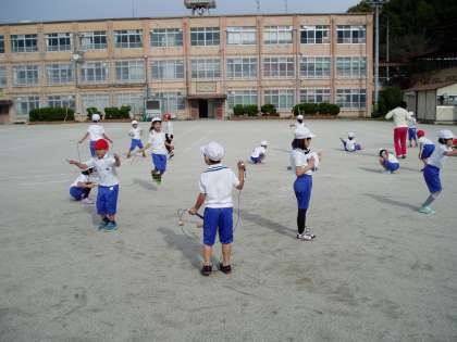 冬の到来を感じさせる気温の中,1年生の子どもたちは体育科の学習で『なわとび』を始めました。前跳びや後ろ跳びに挑戦しながら,友だちの跳び方を見て感想を出し合い,自分の跳び方の参考にしていました。